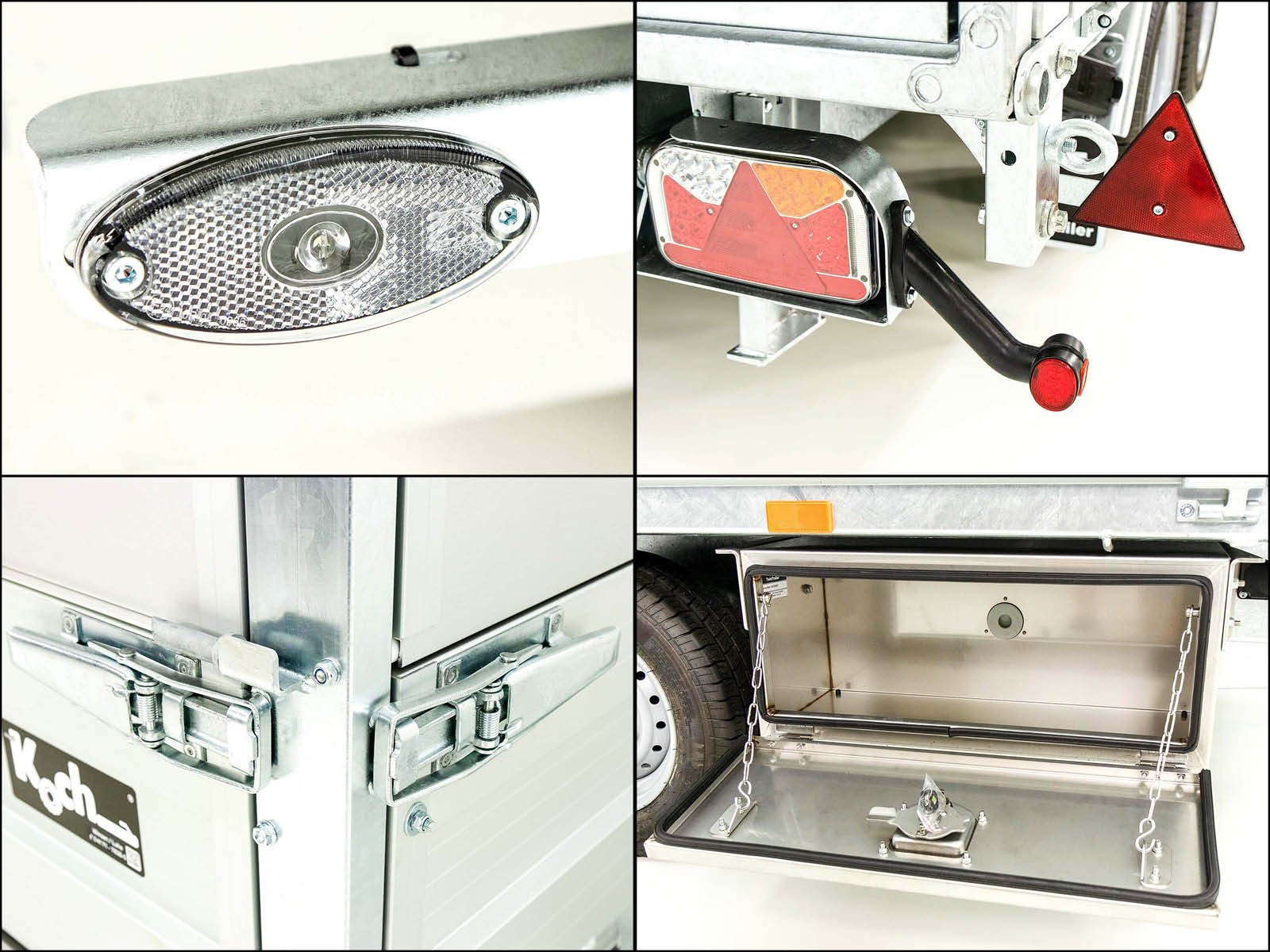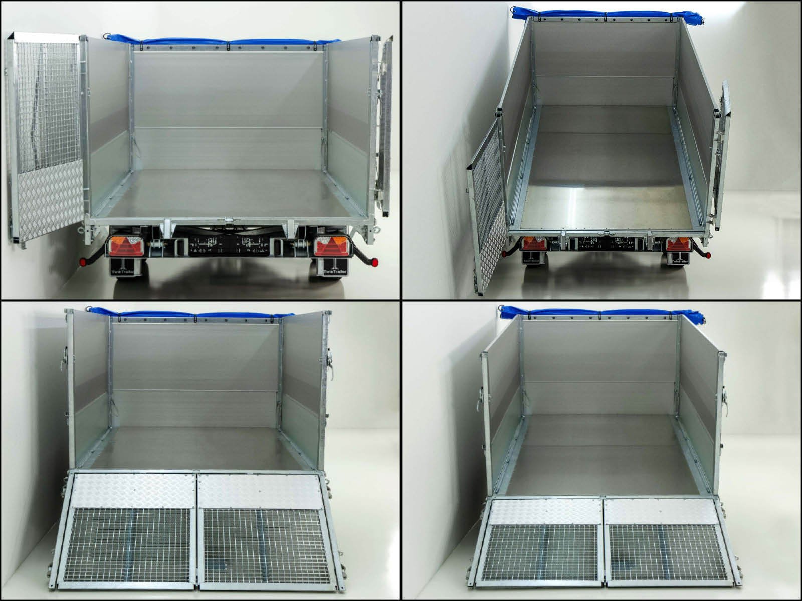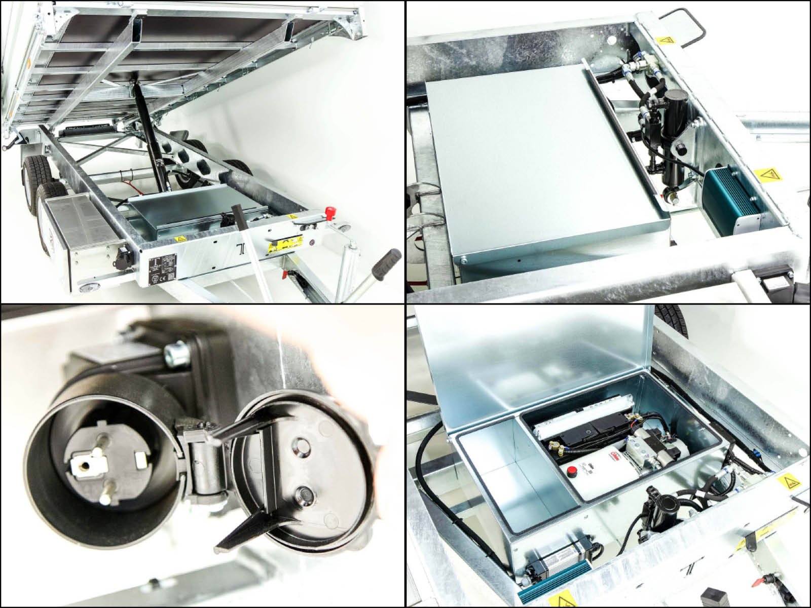 Accessoires: aluminium zijwandverhoging 80 cm, LED-achterlichten, LED-achteruitrijlichten, versterkt groen afdeknet met oprolmechanisme en borging, 2 draadloze afstandsbedieningen, gereedschapskist rechts, ingebouwde lader (10A)