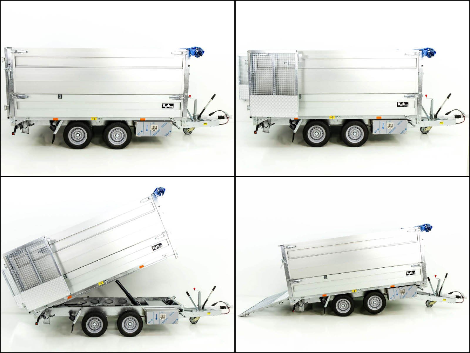 Machine- en kippertrailer met kiephoek ca. 50° en oprijhoek ca. 16°